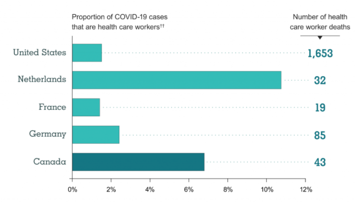 截至6月15日,医护人员感染的病例占加拿大病例总数的6.8%,这一数字高于美国、法国和德国。