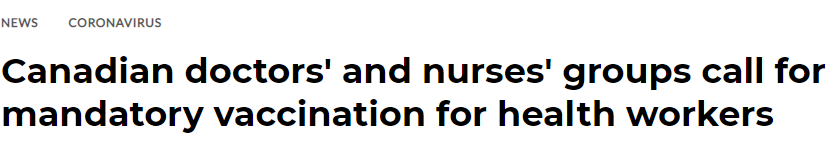 早在八月初的时候,代表加拿大医生和护士的两个组织就联合起来,呼吁该国强制卫生工作者接种COVID-19疫苗。