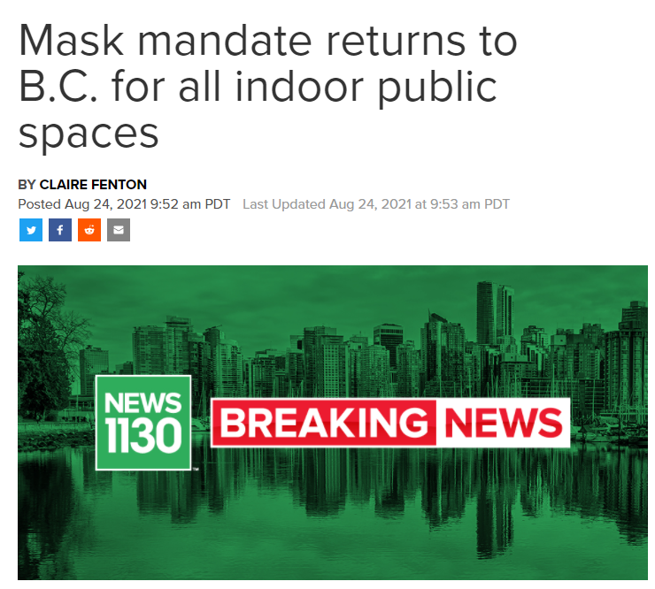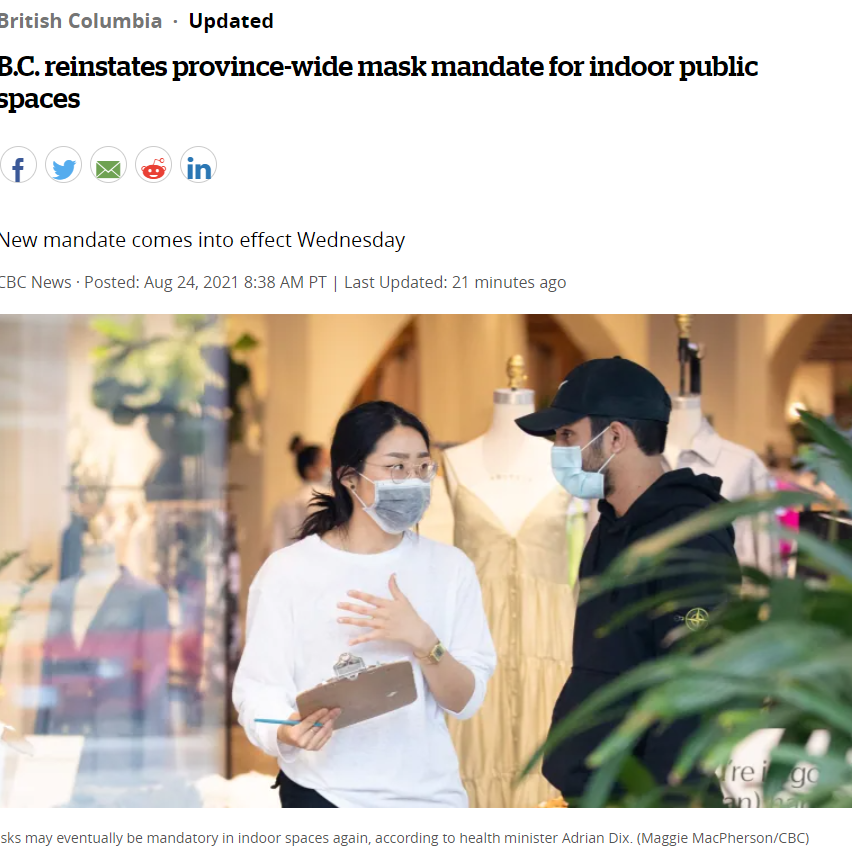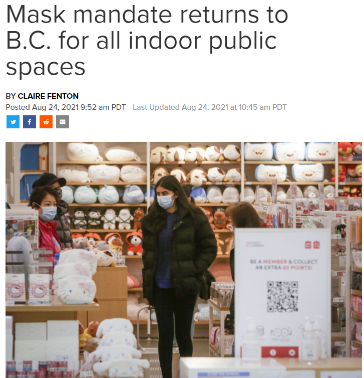 与此同时,首席卫生官邦妮·亨利(Bonnie Henry)宣布,从明天开始,全省范围室内公共场所强制口罩令正式恢复!