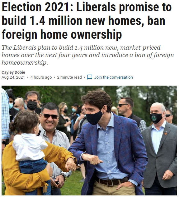 8月24日,加拿大联邦自由党宣布,该党将在未来四年建造140万套新住房,以帮助解决住房负担问题。自由党的住房计划还包括禁止外国人拥有住房,为期两年。这与保守党上周在其住房政纲上做出的承诺相同。