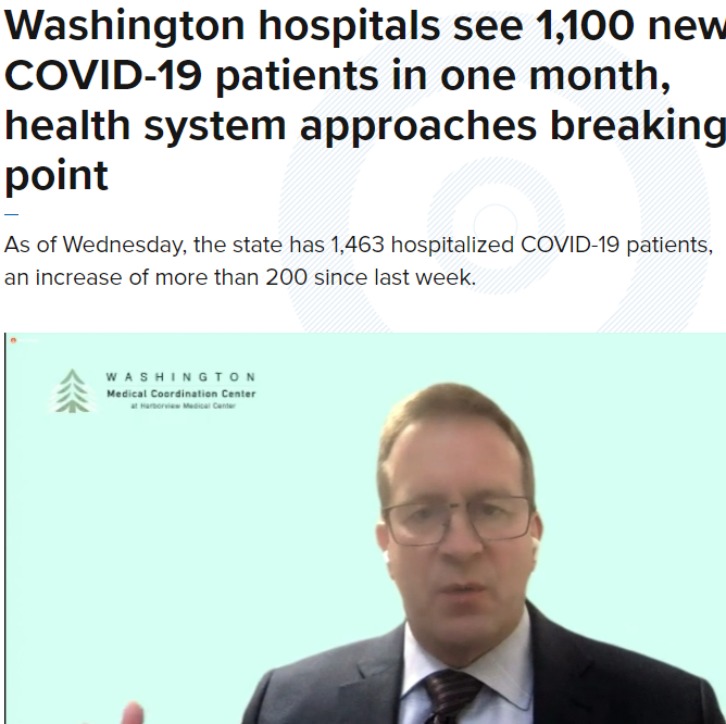 目前,有1463名COVID-19患者住院,过去30天内,有1100名患者住院,相当于2个Harborview医疗中心的容量。