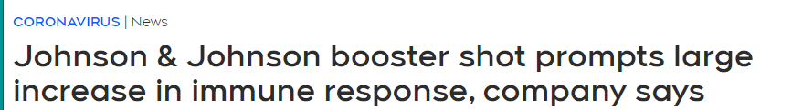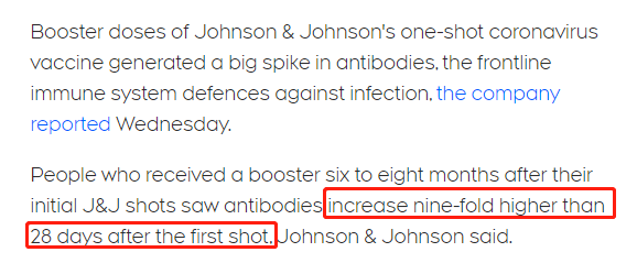 疫苗方面,已经在加拿大完成交付却未开打的强生疫苗,一直受加拿大人关注。强生公司周三表示,在注射完第一针强生疫苗的 6 到 8 个月后打第三针强生疫苗,产生的抗体可在第一次注射后的 28 天增加 9 倍。