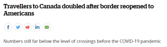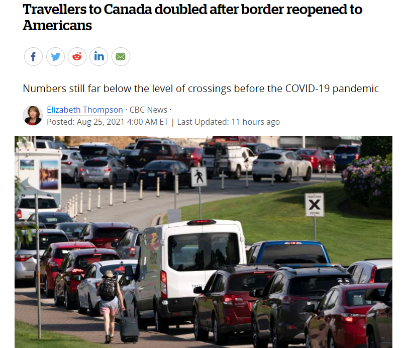 据CBC今日消息,在加拿大解封美加陆地边境的一周内,越过美加陆地边境进入加拿大的人数增加了200%。