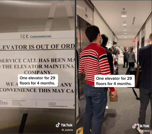 “从我们搬进来的那天起,有一部电梯就坏了。”由于她住在29层,并且COVID-19健康和安全协议限制了进入电梯的人数,等待电梯的总是很长,居民经常变得愤怒。