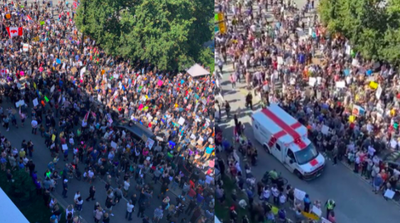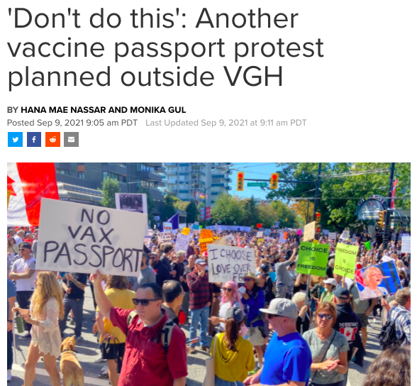9 月 1 日,数千名疫苗护照抗议者聚集在温哥华总医院门前,打扰了医院病人、工作人员和家属,甚至扰乱了医院的正常运作:
