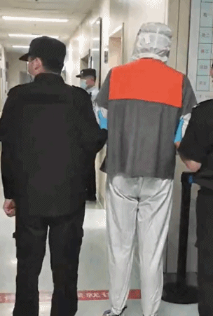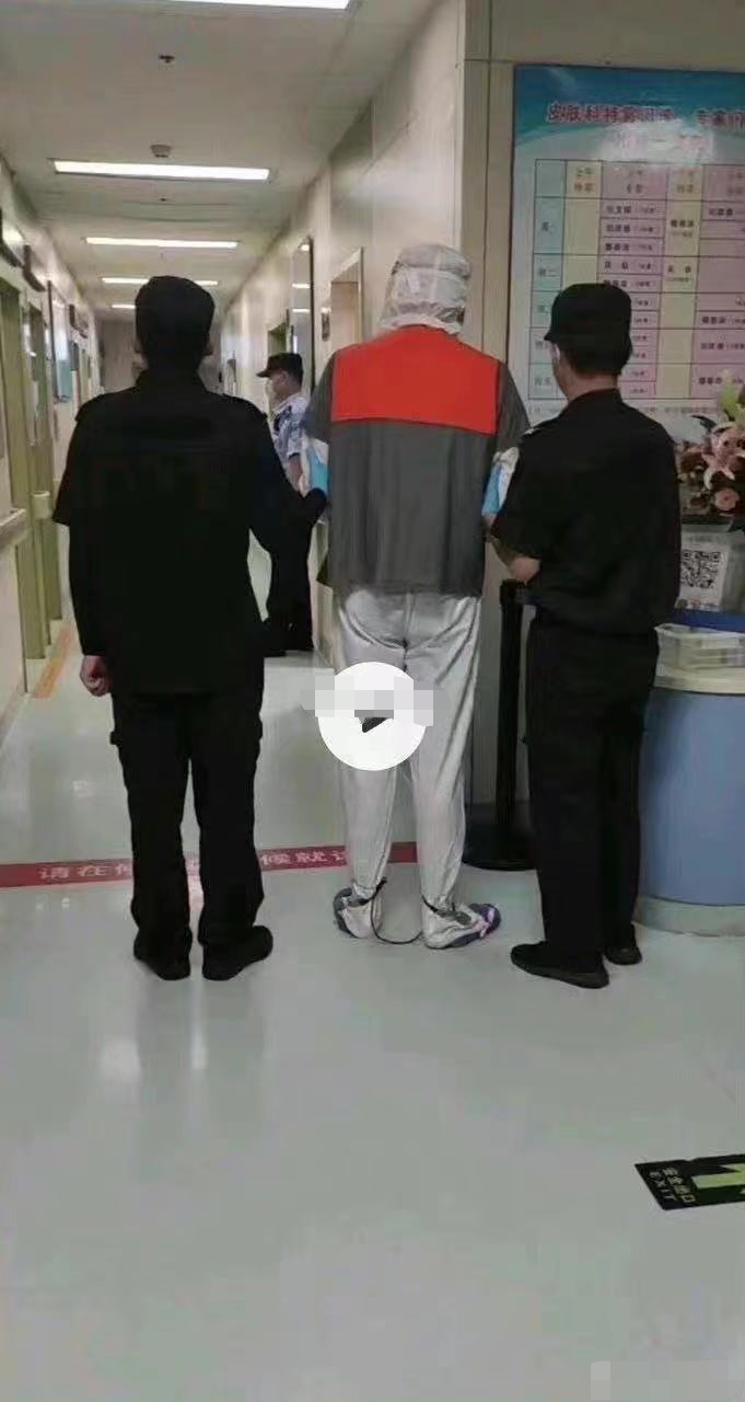 在全网疯传的照片中,可以看到2名穿制服的狱警押着1名身穿灰白橙色防护服的高瘦男子, 在服务台前等待候诊。
