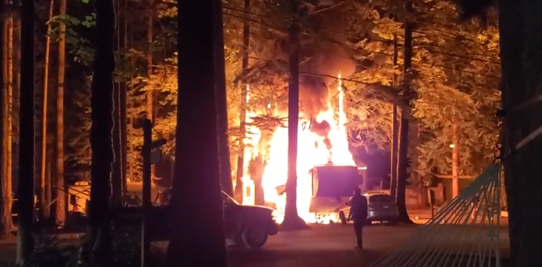 今年7月,BC省旅游胜地Cultus Lake,一辆旅行拖车在 Sunnyside Campground深夜起火。