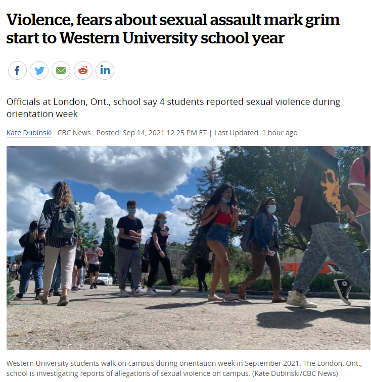 “这是我在这所学校的第三年。我从大一的第一个星期起就遭遇了性骚扰和暴力……所有的管理人员都心知肚明,这种风气在西安大略大学已经根深蒂固……我喜欢在这里学习,但如此多的恐惧和骚扰,让我感到心痛。”