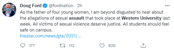 性侵+暴力袭击的阴云笼罩整个校园,校内学生人人震惊又恐慌。目前,此事正在不断发酵,安省警方已经对此展开调查,并逮捕了4人,省长福特今天也发文:“所有性暴力受害者都应该得到正义!所有学生在校园里都应该感到安全。”