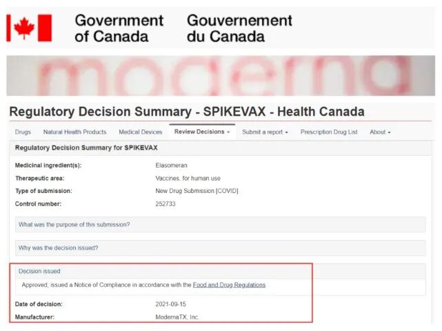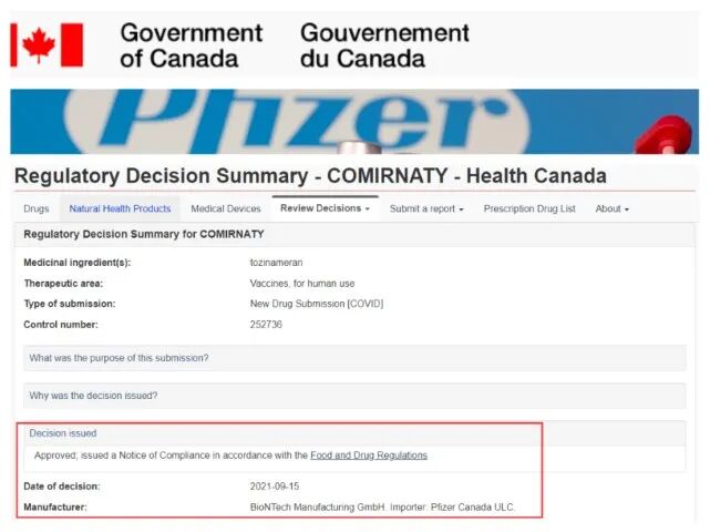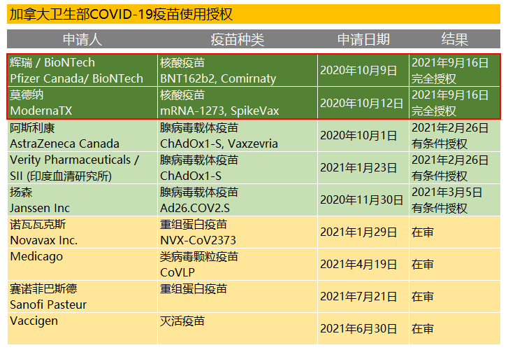 今天(9月16日), 加拿大卫生部向辉瑞和莫德纳公司的 COVID-19疫苗做出了 全面批准(FDR)即完全授权。
