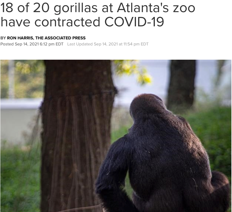 (9月14日) 的一份报告显示, 亚特兰大动物园的 20 只大猩猩中 至少有 18 只核酸检测呈阳性, 而这次爆发是在动物园希望 为灵长类动物获得兽医疫苗 的几天前开始的。