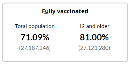 目前加拿大全国12岁以上人群的两剂疫苗的接种率为81%,而总人口的接种率只有71.09%,这其中还有着巨大的上升空间。
