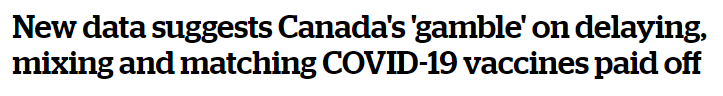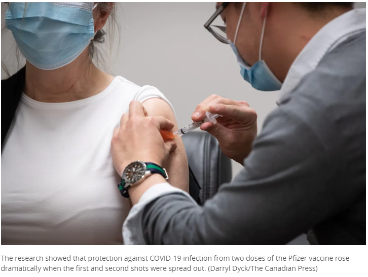 不仅疫苗的范围即将扩大,今天还有的新数据表明,加拿大一直在实施的推迟和混合接种第二剂新冠疫苗的大胆策略,可以为感染、住院和死亡提供强有力的保护,即使是面对着高度传染性的Delta变种。