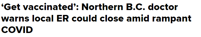 在BC省北部的Vanderhoof,也有医生发出警告称,当地新冠病例激增,医生们已经不堪重负,周末的医生几乎无法轮班,急诊室可能都要被迫关闭。圣约翰医院中一位名叫的Rebecca Janssen医生快要崩溃了,她不得不再三地恳请大家:“快去接种疫苗”。