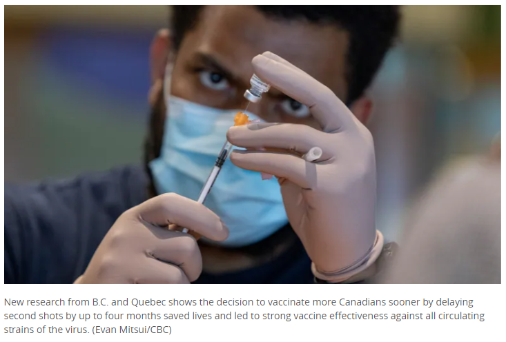 来自BC省疾病控制中心 (BCCDC)和魁北克国家公共卫生研究所 (INSPQ) 的研究人员的初步数据显示,通过将第二针疫苗的接种时间推迟四个月,使更多的加拿大人尽早接种疫苗的决定挽救了生命。