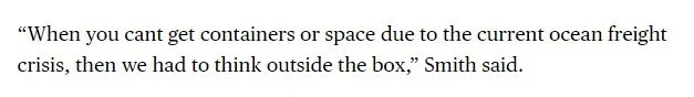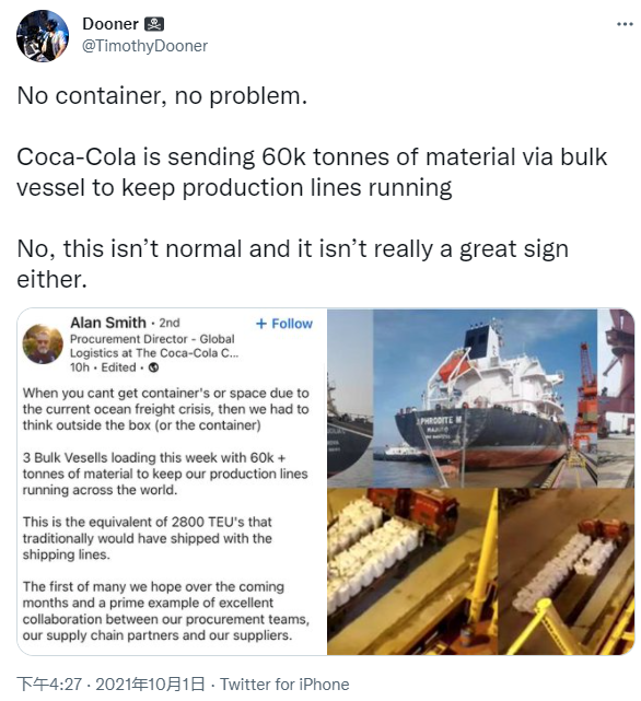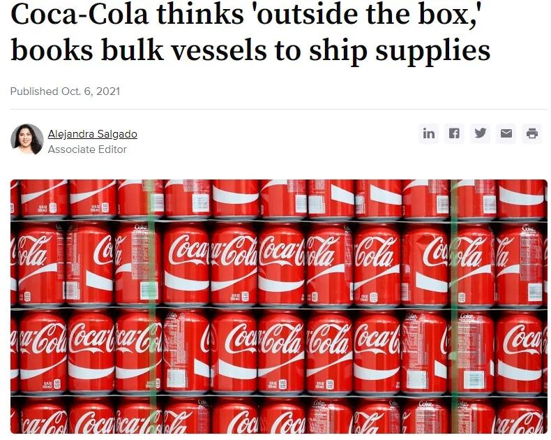 可口可乐公司采购总监Alan Smith 日前在社交平台上表示,“当因为目前的海运危机而无法获得集装箱或舱位时,我们不得不跳出思维定势。”