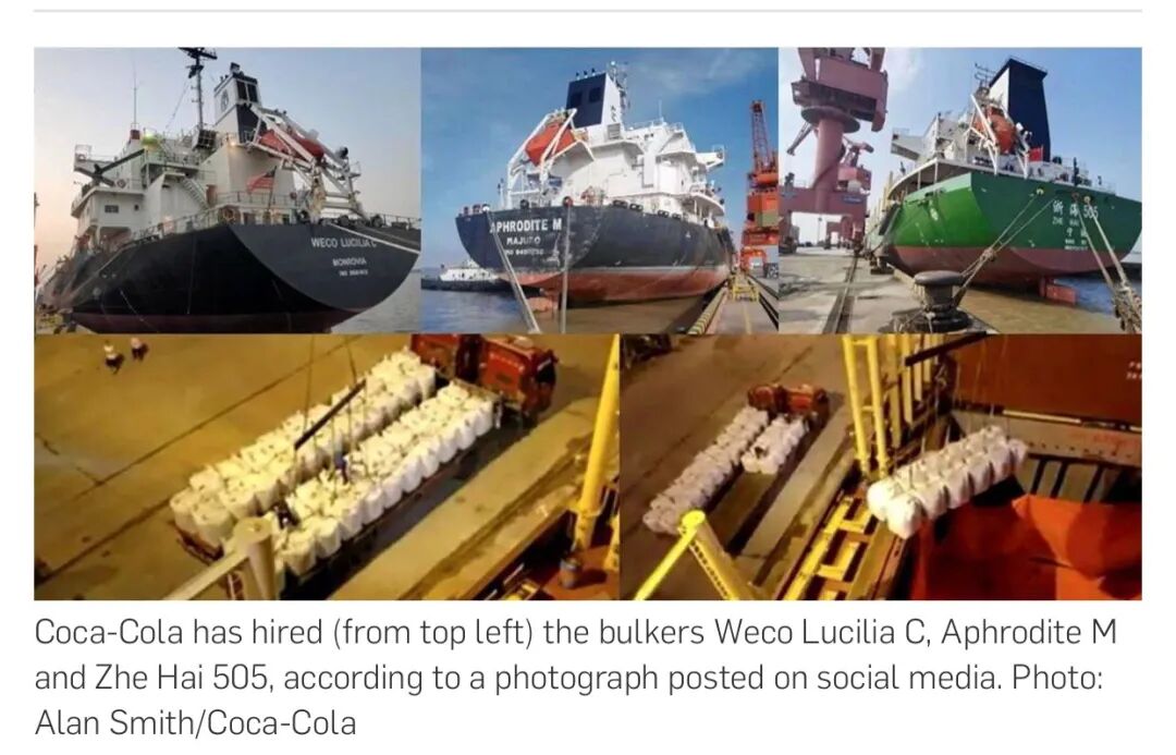 从Alan Smith提供的照片显示,可口可乐公司租赁的三艘散货船分别是34,400 载重吨的 Aphrodite M、35,000 载重吨的 Weco Lucilia C 和 35,130 载重吨的浙海 505。