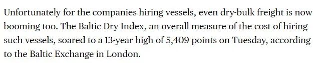 不幸的是,现在对于租用船只的公司来说,要是不抓紧,再过一段时间,散货船的运输费也该飙上去了...