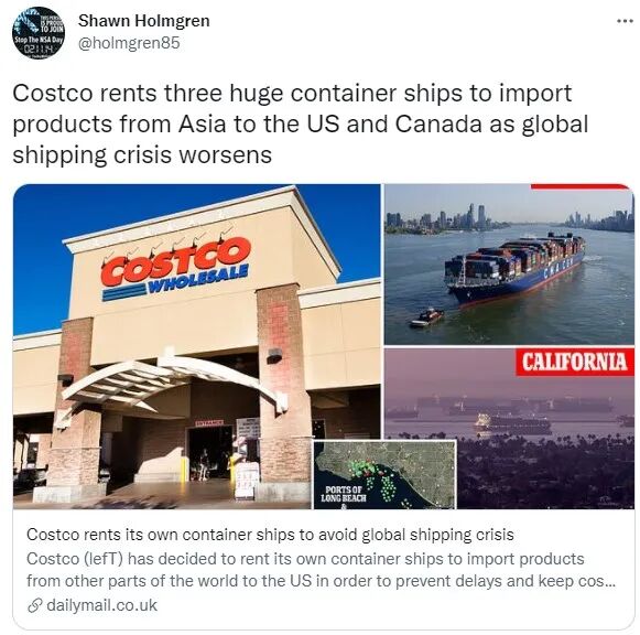 比如Costco,在9月末时宣布,将租用了三艘巨型集装箱船从亚洲进口产品到美国和加拿大。这将帮助Costco避免以花费正常价格的6倍,通过第三方运输。