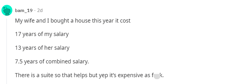 还有人举例,他和老婆今年买了栋房子,然后发现自己不吃不喝工资17年才能还完房贷,老婆13年工资,或者俩人一起7年半才行。生活真是太贵了!