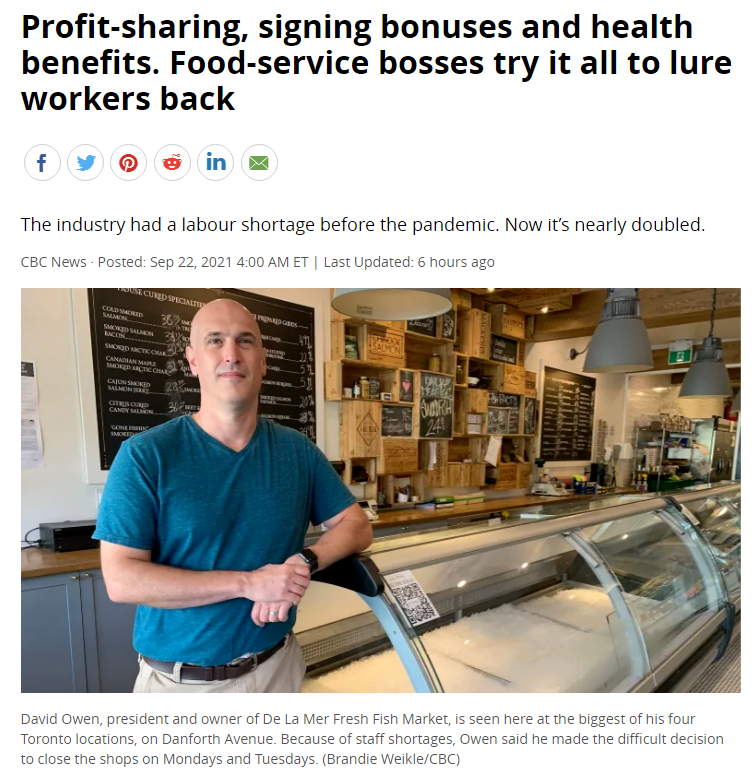 多伦多Danforth上一家De La Mer鱼店的老板Owen说,已经让员工多休假或减少工作时间,向员工引入了利润分享。如果符合某些绩效标准,就发奖金。他还为所有全职员工增加了医疗福利,包括处方药、牙科和按摩治疗等。