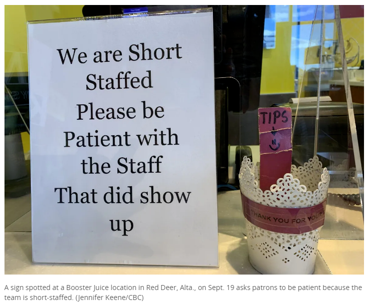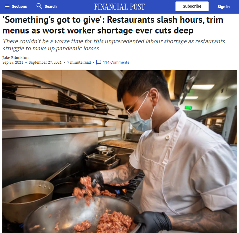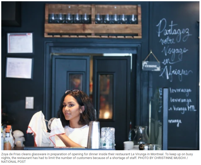 加拿大的餐馆、酒吧、熟食店、面包店和其他小型食品店,现在都面临没有足够的人手来满负荷营运的局面。