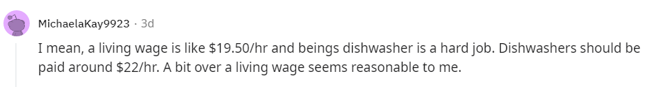 有人表示现在维持生活的工资大概$19.50,而洗碗工是个辛苦活,应该至少给$22/小时。所以$25的工资我觉得很合理。