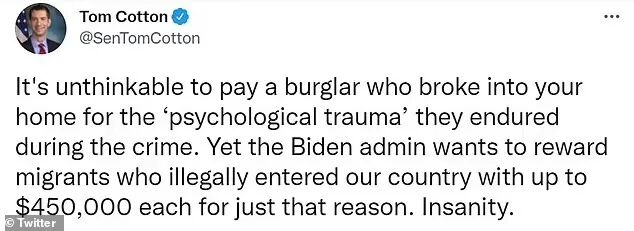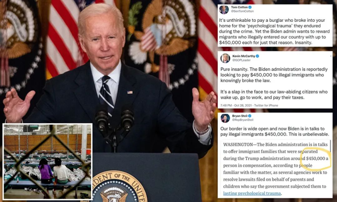阿肯色州参议员汤姆·科顿说:窃贼闯入你家,说在犯罪过程中遭受“心理创伤”,然后你还要赔钱给他,这实在令人难以想象。然而,拜登政府却想要奖励非法进入我们国家的移民,每人最高可达45万美元,精神错乱!