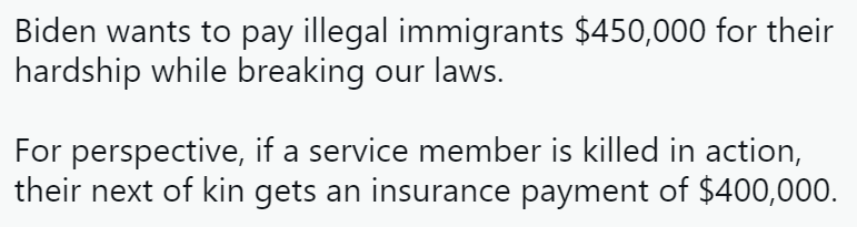 德克萨斯州共和党众议员丹·克伦肖(Dan Crenshaw)在推特上抨击:拜登政府想给这些非法移民45万美元,以作为他们违法的补偿,一个为美国战死沙场服役人员,抚恤金40万...”
