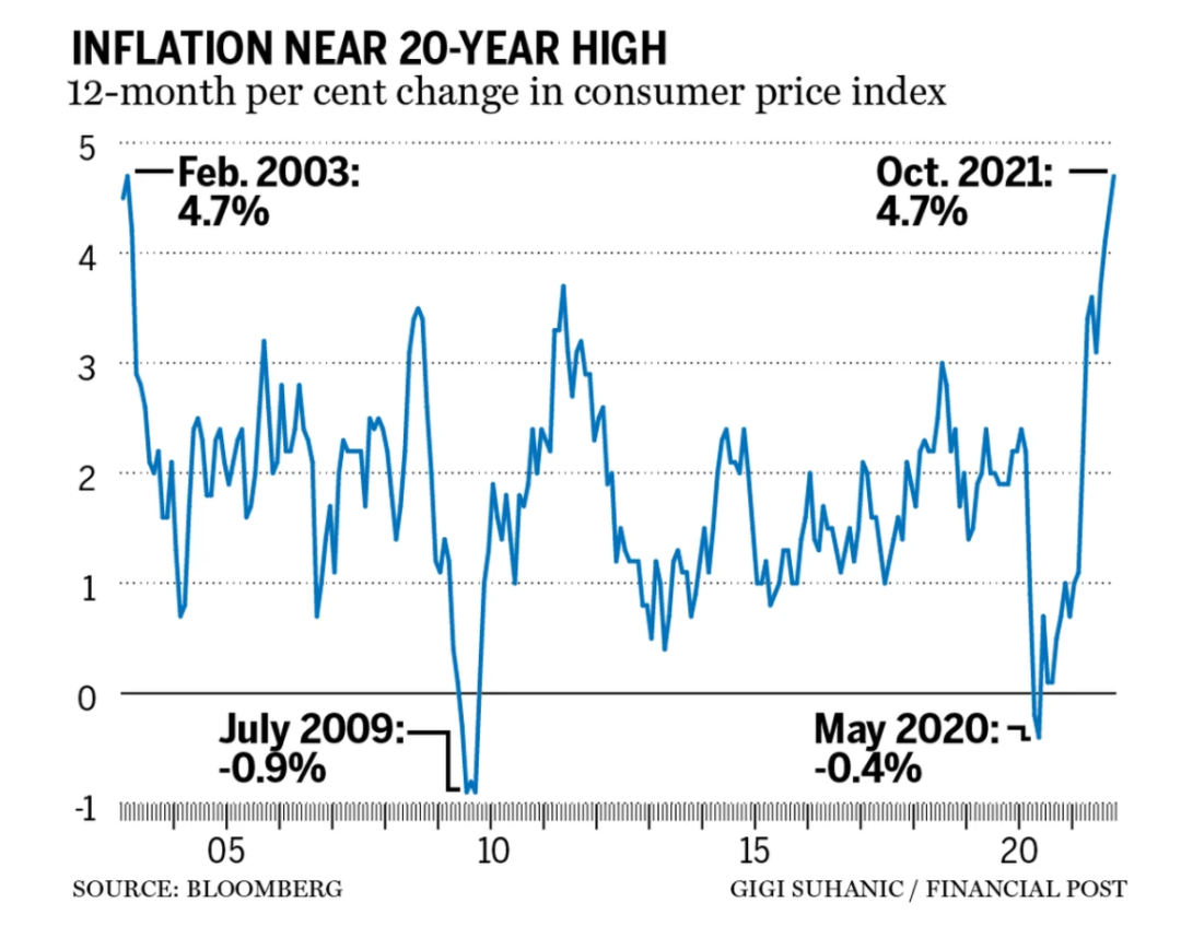 加拿大报告的通货膨胀率连续六个月高于 3%——加拿大央行控制范围的上限。当周三公布 10 月份的通胀数据时,这种连续性几达到了7 个月,且通胀上涨 了4.7%。