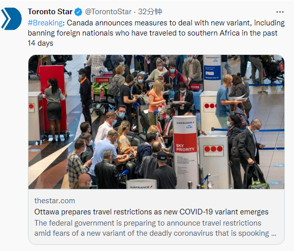 加拿大联邦政府也在今日(周五)下午宣布,禁止过去14天到过非洲南部7个国家的所有旅行者入境!从南部非洲地区返回的加拿大人在抵达加拿大之前必须在最后一个过境地接受检测,并遵守新宣布的措施。