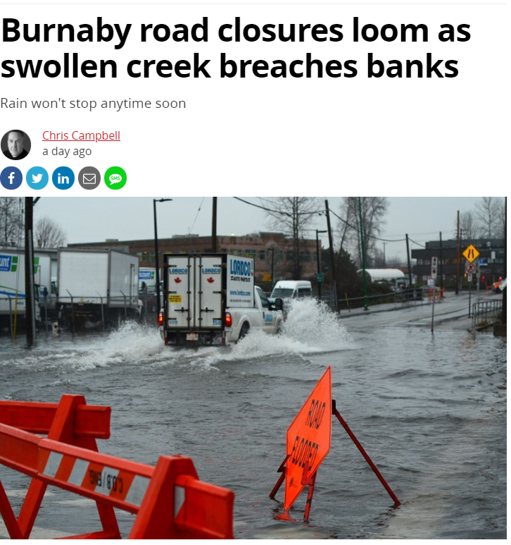根据当地的最新消息,本拿比的斯蒂尔克里克(Still Creek)地区出现洪水,河岸都被淹了,以下道路现在正处于危险情况,可能随时都会封锁,请所有司机出行前查看路况——