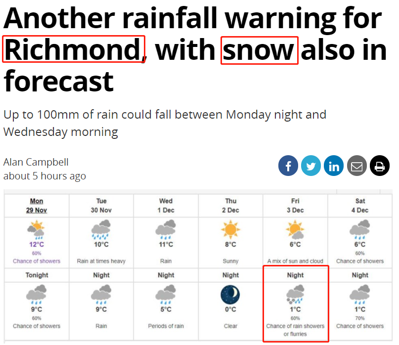 值得注意的是,大温地区华人聚居城市列治文这一次也提前收到了天气预警——强降雨降至,且本周末可能迎来初雪!