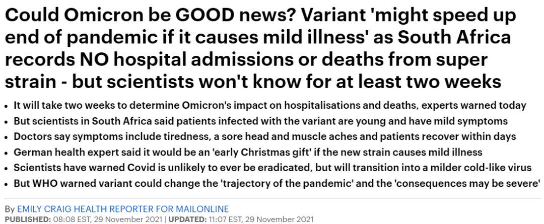 劳特巴赫教授认为,Omicron变种的突变非常之多,有大约 50 个突变,其中超过 30 个位于刺突蛋白上,是Delta变种的两倍——乐观来看的话,这说明Omicro正在经过通过改造自己的方式,在提高感染率的同时降低致命性,这也和大多数呼吸道病毒的进化方式一致。