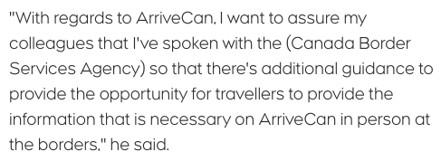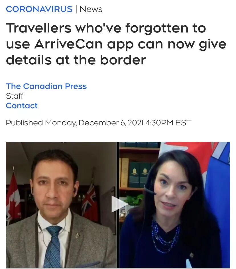 加拿大公共安全部长马可·门迪奇诺 (Marco Mendicino) 说,“关于ArriveCan,我想向我的同事们保证,我已经与加拿大边境服务局谈过了,以便有额外的指导,为旅行者提供机会,让他们在边境亲自提供ArriveCan上必要的信息。”