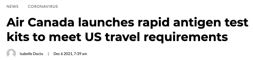 加航与加拿大医疗保健公司Switch Health合作,推出抗原检测试剂盒,可以在出发前一天在家中进行自我测试。