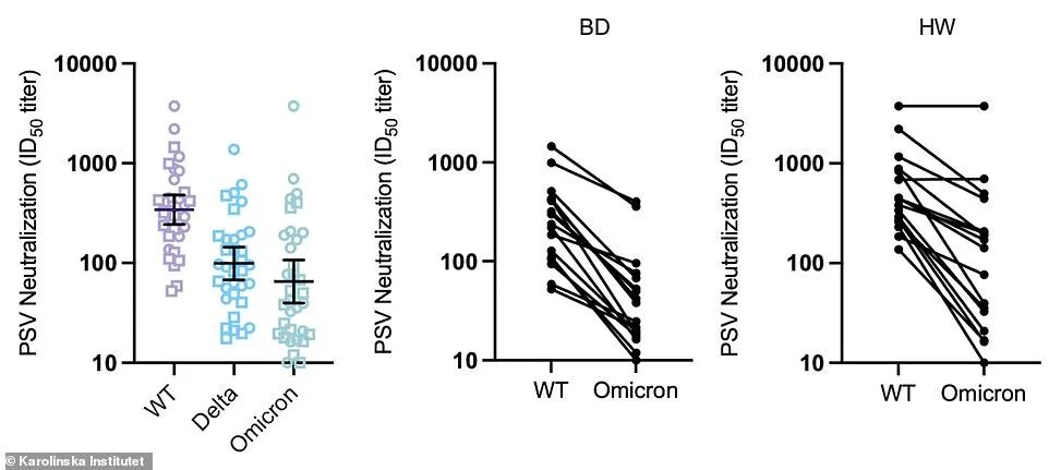 (瑞典斯德哥尔摩卡罗林斯卡学院的研究人员进行基于最近斯德哥尔摩17人的血液样本(如中间的图表所示),与之前感染了原始原始菌株的17名医院工作人员(如右图所示)进行比较。中图和右图显示了与Omicron相比,暴露于原始变种(WT)时参与者的抗体水平。左图显示了暴露于原始菌株(紫色)、Delta(蓝色)和Omicron(绿色)时两组的平均抗体水平。)
