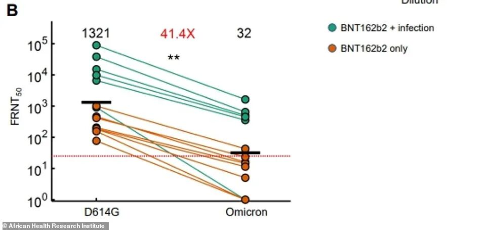 (该图显示,当12个人接触到旧版病毒(D614G)时,他们的抗体水平--科学上称为几何平均滴度(GMT)FRNT50--平均跃升至1321。但是当科学家对他们的血液进行Omicron测试时,抗体水平下降到平均32,标志着41.4倍的下降。六名志愿者被辉瑞公司(橙色)双刺,而另一半志愿者被辉瑞公司双刺,并且之前对Covid检测呈阳性。以前感染过Covid的人的保护能力最强 )