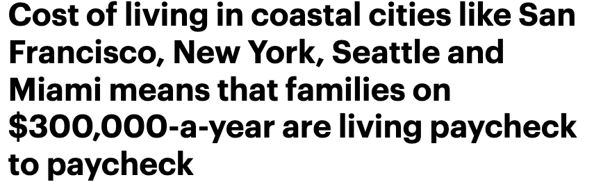 “想在纽约这种昂贵的沿海城市长久地生活下去,一户家庭每年至少需要赚够30万美元。”