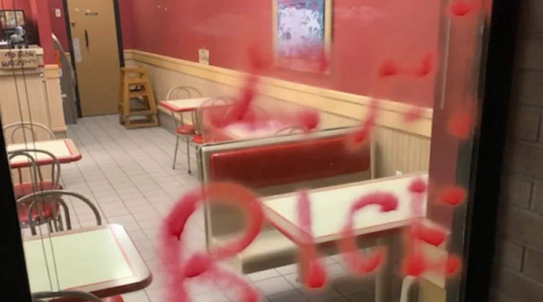 事情还没完,紧接着就在上周一(11月29日),Pham上班时,看到所有的三扇窗户上写满了种族主义涂鸦,“f-you China”, “go back to China” 和“eat rice”等仇恨亚裔的内容。