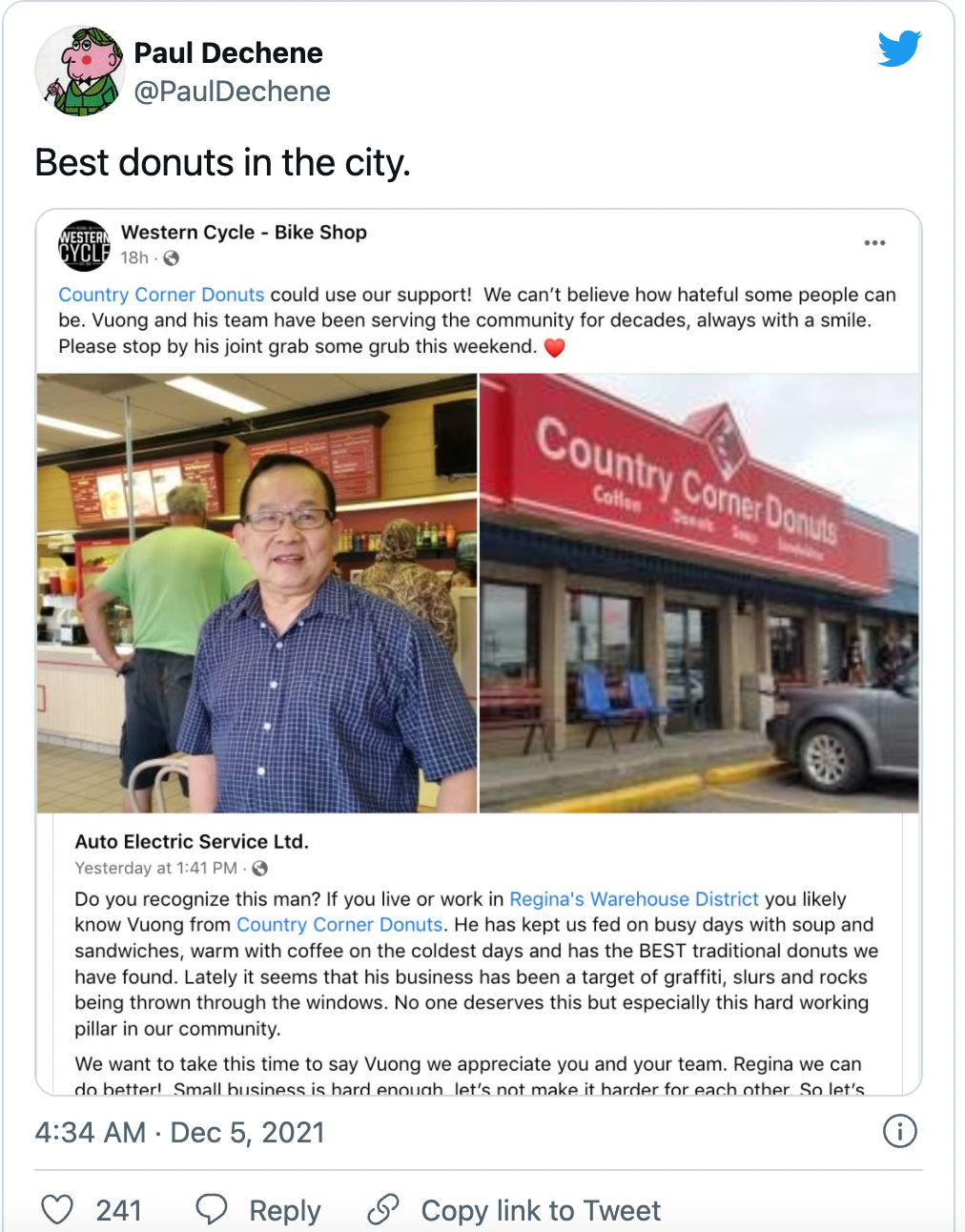 “大家一起来支持Country Corner Donuts这家店吧!我们难以想象那些仇亚的人会做出什么过分的事来。