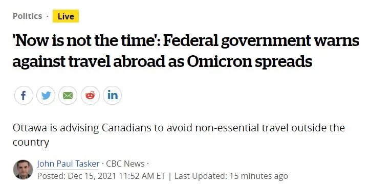 加拿大面对来势汹汹的奥密克戎病毒Omicron,再次宣布类似“封国”的旅行指南,不建议非必要的出国旅行计划。