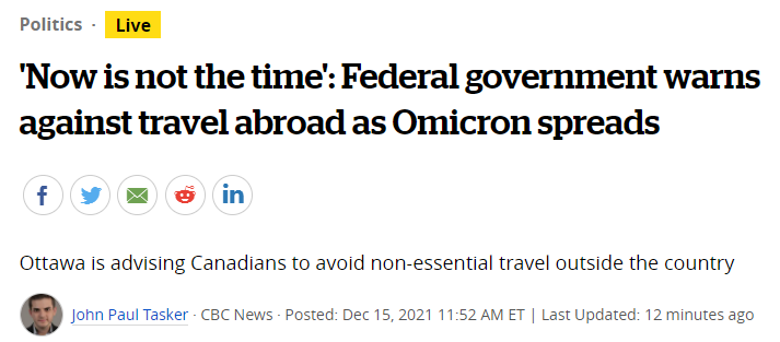 12月15日下午,加拿大卫生部长杜克洛斯(Jean-Yves Duclos)今天发出旅行警告,警告加拿大人未来四周不要出国旅行,强烈建议计划出国旅行的加拿大人尽快取消他们的旅行。
