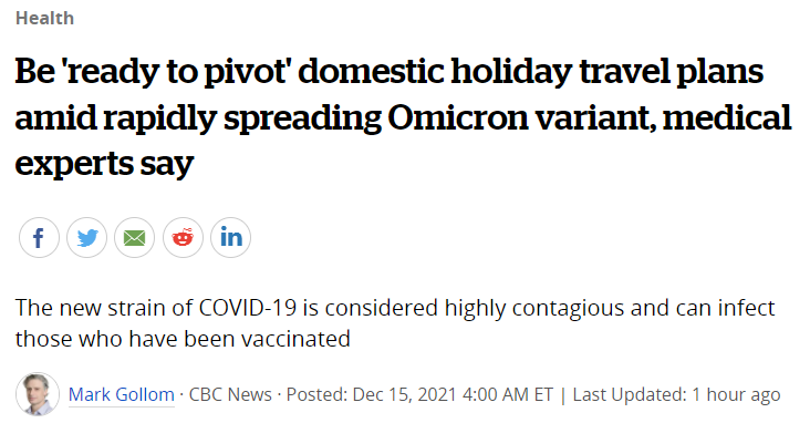 研究COVID-19的医学专家表示,Omicron变种的迅速传播,意味着加拿大人应该准备取消他们在假期期间的国内旅行计划。