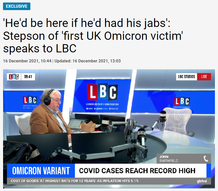 英国伦敦广播电台LBC接到了自称是全球Omicron首例死亡患者家人的电话,公开了这位死者的部分身份。
