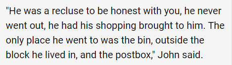 “他就跟隐居了一样,他从来没有离开过房间,我和姐姐平时给他送吃的东西,他每天唯一需要出门干的事就是去倒垃圾和查看信箱。”