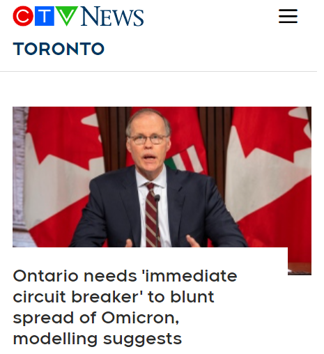 顾问组的最新疫情模型显示,如果不靠“某种形式的熔断(circuit breaker)”以减少全省至少50%的社交接触,单单接种加强针注射,根本难以阻止在2021年底前Omicron在安省大爆发——达到日增确诊6,000例到1万例以上的水平。