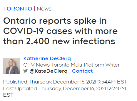 截止发稿前,加拿大12月16日的日增确诊病例已经突破5,500例,其中安大略省和魁北克省分别贡献2,421例和2,736例。