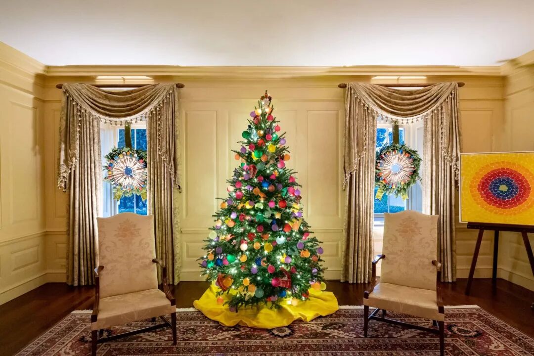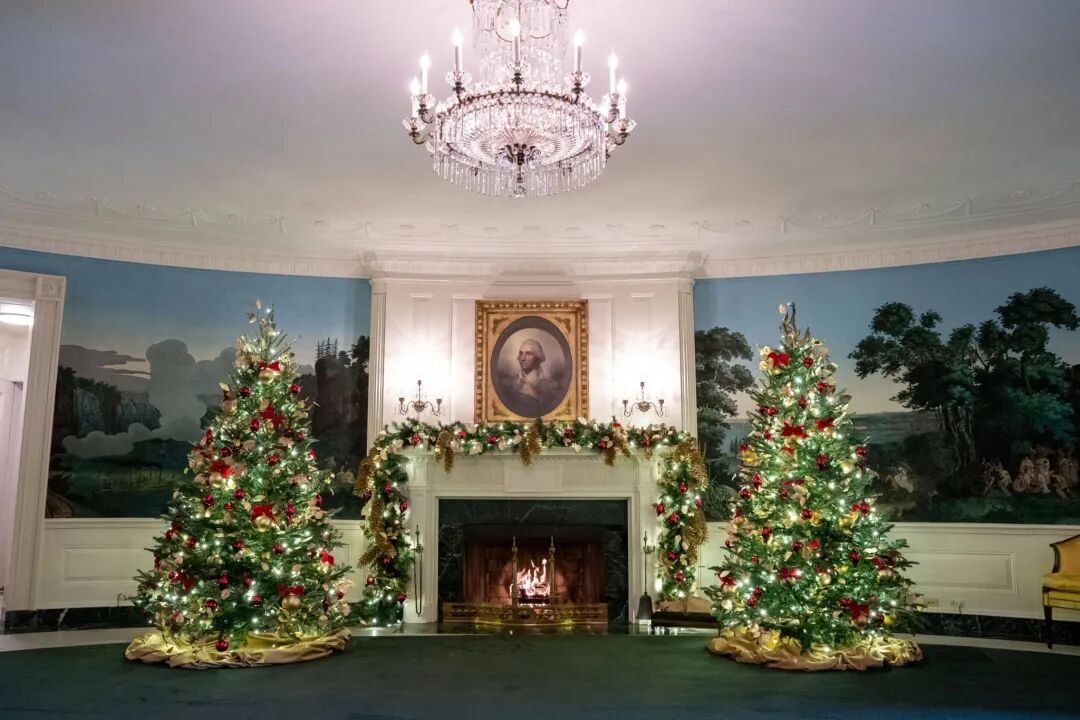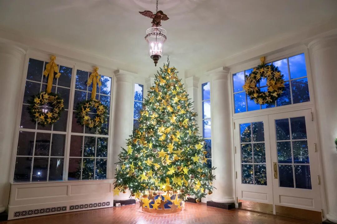 从艾森豪威尔政府开始,一棵巨大的圣诞树一直是蓝屋的特色。这个假日季的焦点是一棵来自北卡罗来纳州杰斐逊市(Jefferson)的18.5英尺高的弗雷泽冷杉(Fraser Fir),它从地板到天花板一直矗立在椭圆形的房间里。