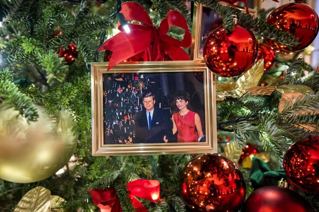 (总统约翰·f·肯尼迪和他的夫人杰奎琳·肯尼迪·奥纳西斯的照片也装饰了圣诞树。)